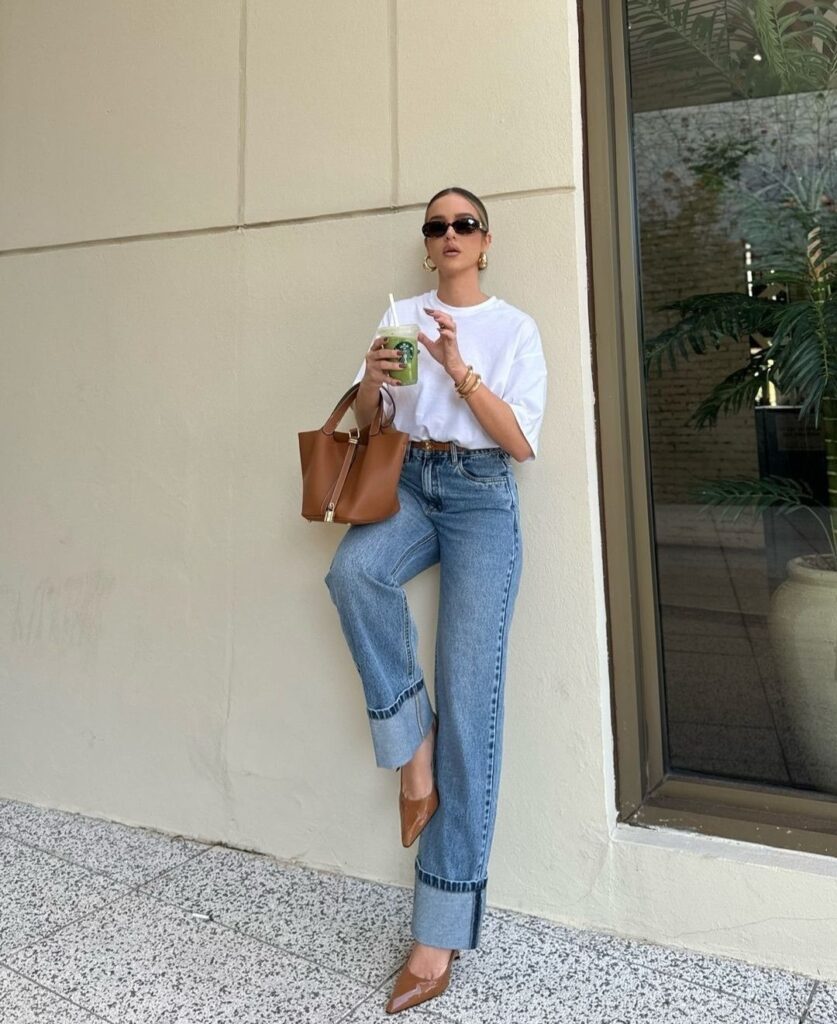 This look gives your classic white tee and jeans combo a bold refresh. The statement cuffed denim adds instant interest, elongating the legs and creating a modern silhouette that still feels timeless. Tucked neatly into the jeans, the oversized tee keeps the outfit feeling effortless, while the brown pointed-toe heels elevate it with polish.