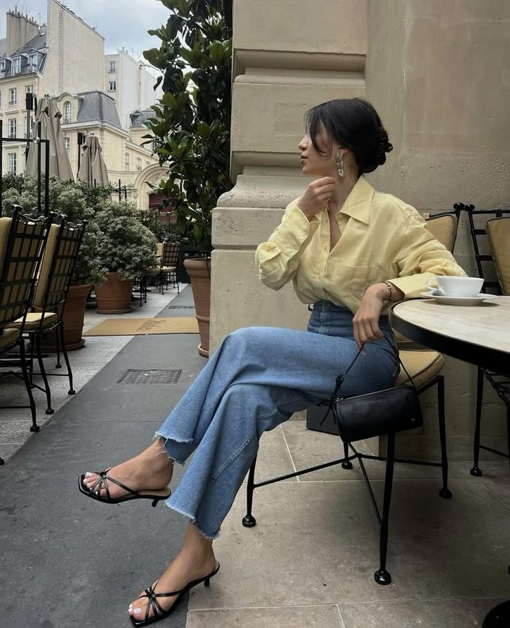 A soft yellow button-down tucked into relaxed high-rise jeans brings out an understated elegance perfect for daytime sophistication. The look is effortlessly balanced with strappy black heels and a minimal black shoulder bag, adding a refined contrast to the casual denim.