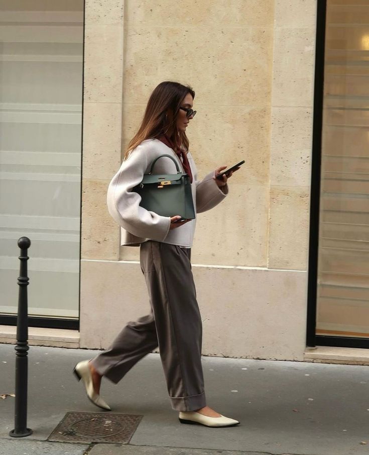 The palette is soft, but the silhouette is strong—proof that you don’t need loud prints to make a statement. Add a structured top-handle bag in an unexpected tone (we see you, forest green), and you’ve nailed the formula for 2025’s new power dressing. Pro tip: keep your pants cuffed to show off the full elegance of your flats—yes, they deserve the spotlight.