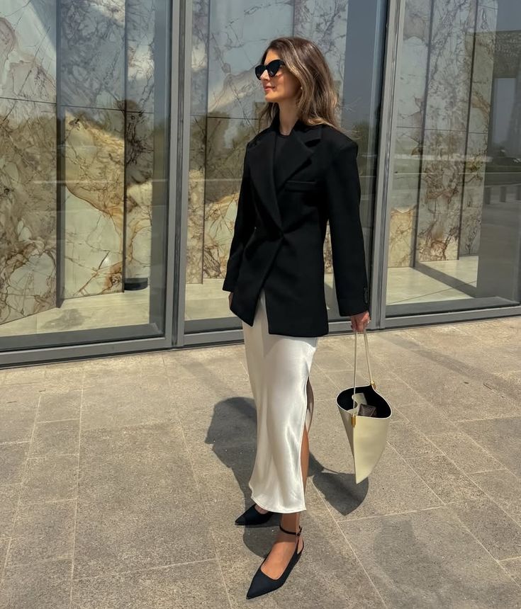 Channel your inner minimalist icon with this power pairing: sharp pointed-toe flats and a silk midi skirt that sways with every step. The structured black blazer brings balance to the soft, luminous fabric, while the slingback flats add a grounded, effortless vibe.