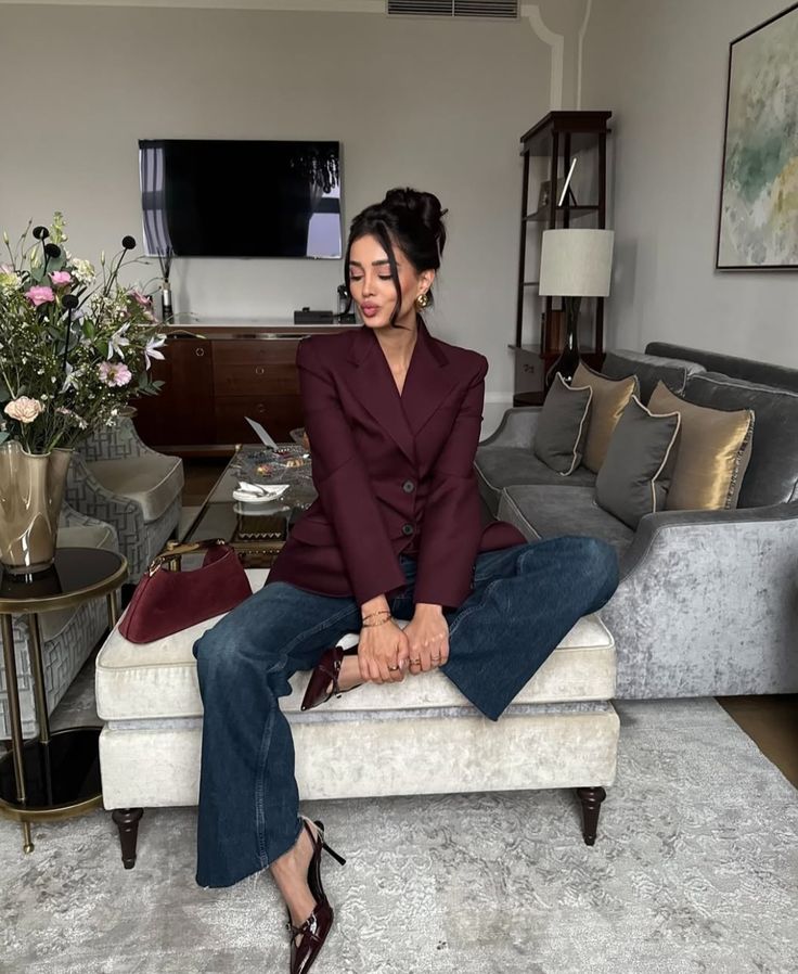 This look is a masterclass in understated power dressing. The rich wine-hued blazer brings a tailored sharpness to the ensemble while also adding warmth and depth, setting a luxurious tone. It’s perfectly balanced by the relaxed cut of the dark-wash jeans, creating a silhouette that feels strong and laid-back.