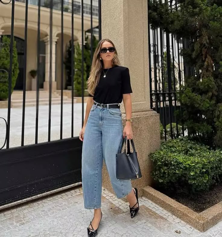 A classic black top is tucked into high-rise, light-wash jeans with a relaxed, cropped fit that offers just the right amount of structure. The black belt cinches the waist for a clean finish, while the glossy black flats with an oversized bow detail add a chic, feminine twist.