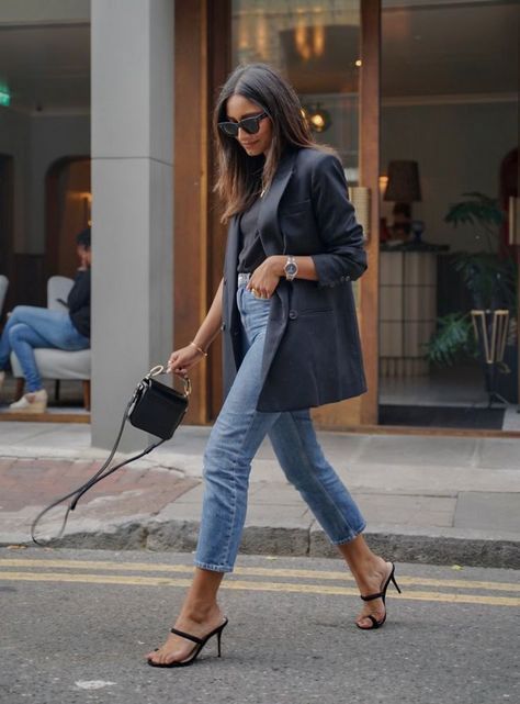 This outfit is a masterclass in balancing sophistication with casual cool. The tailored black blazer adds structure and polish, layered over a simple black top for a sleek monochrome base. The mid-wash skinny jeans keep the look grounded and easygoing, while the strappy black heels add a refined, feminine edge.