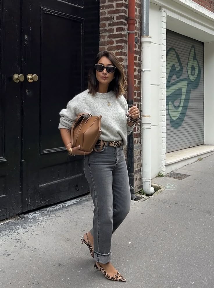 A soft grey knit and cuffed charcoal jeans create the perfect foundation for an elevated casual outfit, but it’s the leopard kitten heels that steal the spotlight. Bold yet wearable, these pointed shoes bring a chic, feline flair that transforms an otherwise cozy combo.
