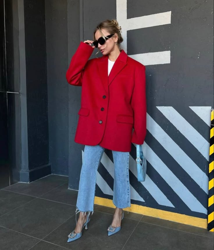 Vibrant color and refined sparkle come together in this sharp, fashion-forward pairing. The oversized crimson blazer makes a strong statement, its structured silhouette perfectly offset by light-wash cropped jeans with a raw hem.