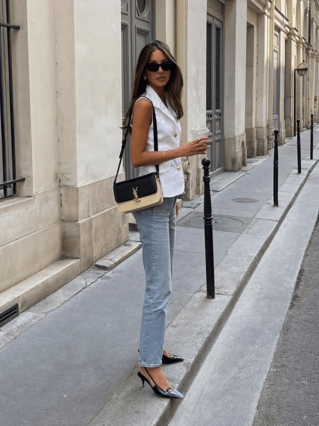 A structured sleeveless white blouse and a two-tone designer shoulder bag complete the ensemble, striking a balance between casual ease and sophisticated edge. The low heel height adds elegance without sacrificing comfort, making this combination ideal for everything from morning café runs to evening strolls through the city.