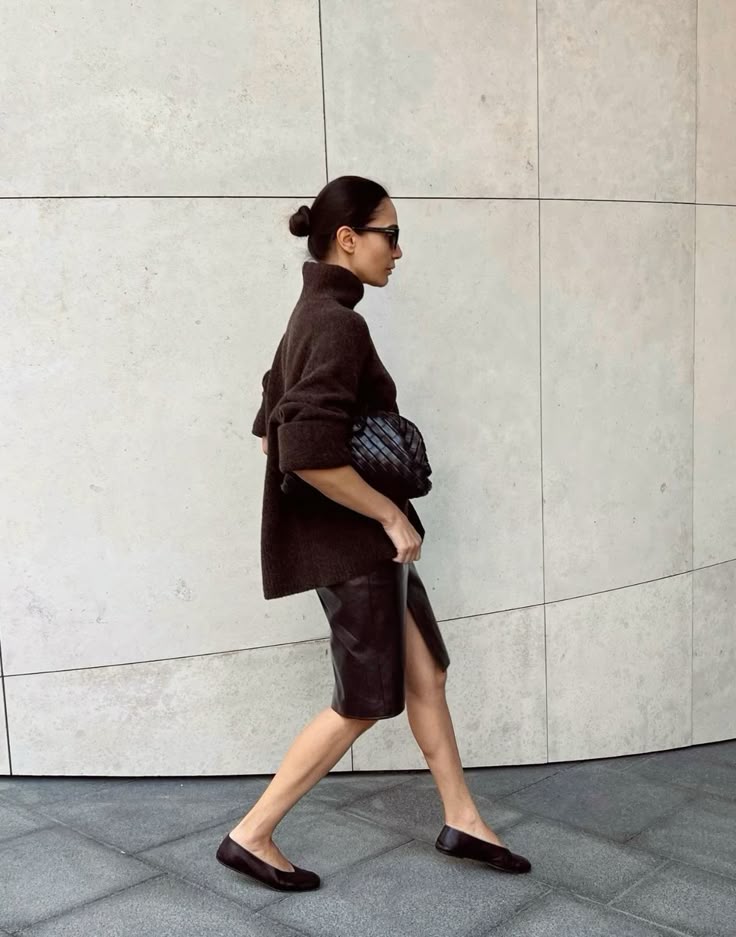 A masterclass in tonal dressing, this deep-chocolate leather skirt pairs flawlessly with an oversized turtleneck in a matching hue, delivering a look that’s refined yet undeniably modern.