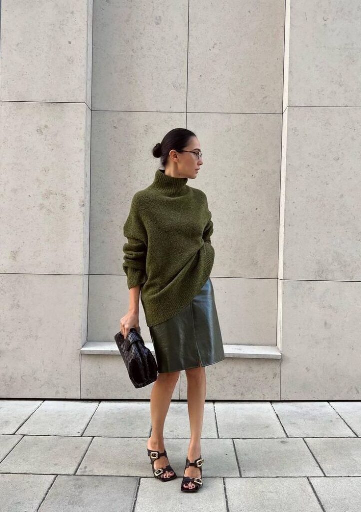 Blending rich textures with sophisticated tones, this outfit is a masterclass in understated elegance. The oversized moss-green turtleneck adds cozy volume, while the structured leather skirt balances the silhouette with sleek refinement.