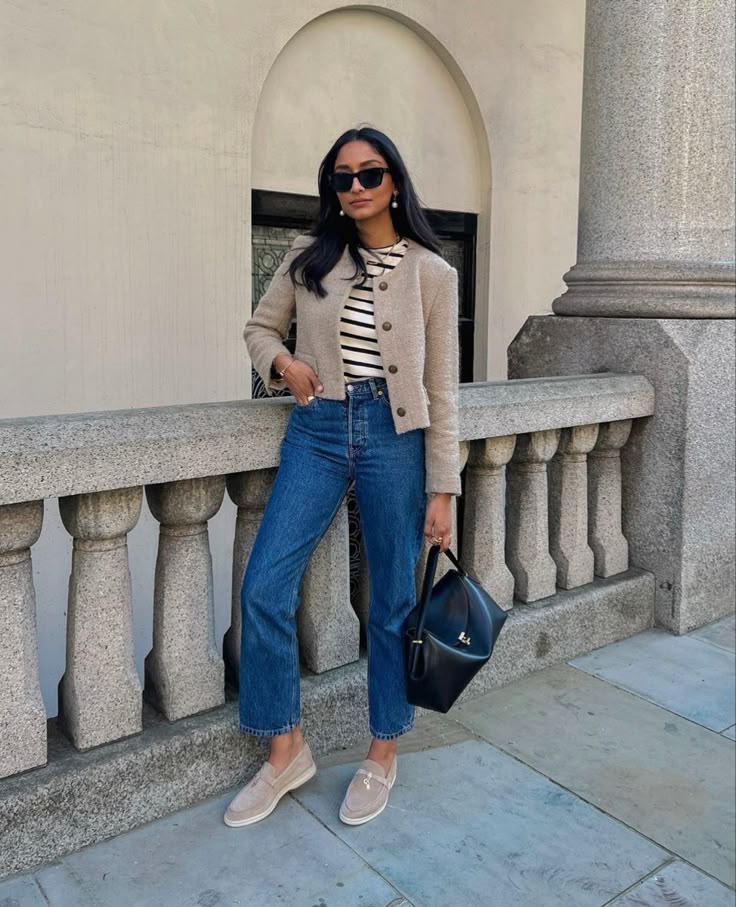 This effortlessly polished outfit highlights exactly why Loro Piana loafers are a timeless staple in any wardrobe. The classic beige loafers ground the look with understated elegance, complementing the structured neutral-toned jacket and striped top combination. Straight-leg denim adds a relaxed touch, striking the perfect balance between casual and chic.