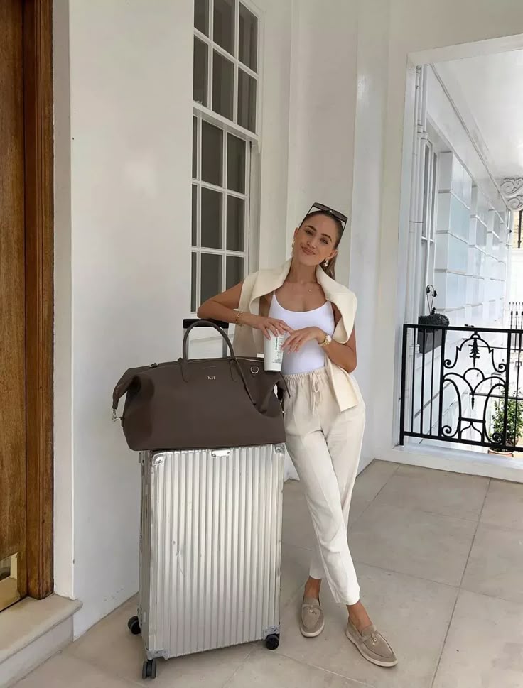 The oversized structured weekender bag and sleek silver suitcase complete the ensemble, proving that comfort doesn’t have to sacrifice elegance. This is a go-to outfit for those who want to look polished from the airport lounge to their final destination.