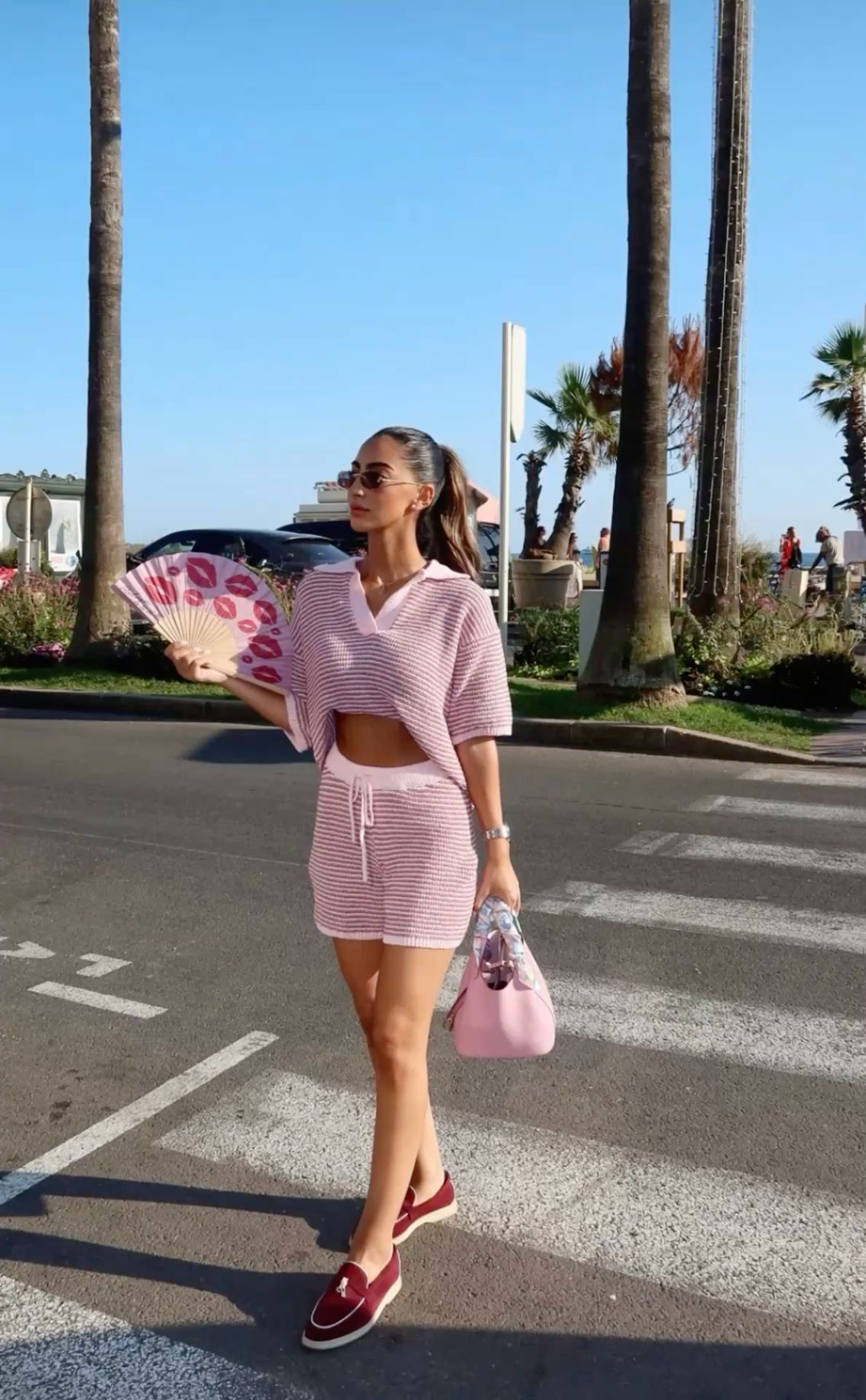 A soft pink handbag and a playful printed fan amplify the summery vibe, proving that casual wear can still feel refined and curated. It’s the kind of look that blends comfort with style, ideal for those sun-soaked days when you want to stay cool without compromising on chic.