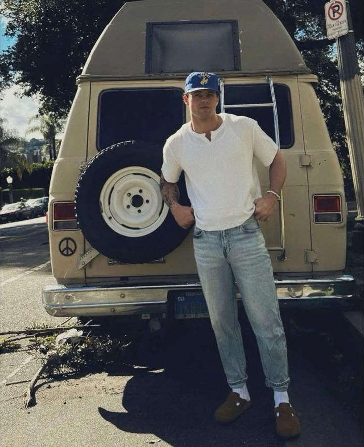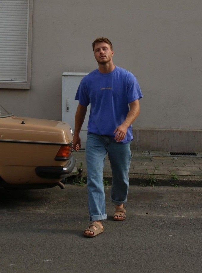 A breezy, laid-back vibe comes through when jeans are paired with slip-on sandals, creating a perfect warm-weather balance. The relaxed fit of the light-wash denim with a rolled cuff highlights the footwear choice, while the bold blue tee adds a pop of color and keeps the outfit youthful.