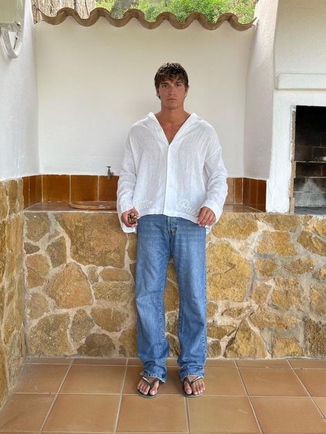Flip-flops paired with relaxed jeans and a breezy linen shirt capture a carefree, beachy attitude perfect for warm destinations. The loose fit of the shirt and denim keeps the look effortless, while the open neckline and lightweight fabric enhance the easygoing mood.