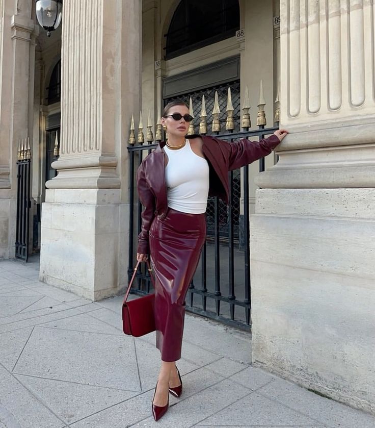 This bold monochrome ensemble is a masterclass in sleek sophistication. The glossy burgundy leather midi skirt takes center stage, hugging the figure and reflecting the light just enough to command attention. Paired with a matching leather jacket and pointed stilettos, the look radiates confidence while remaining polished.