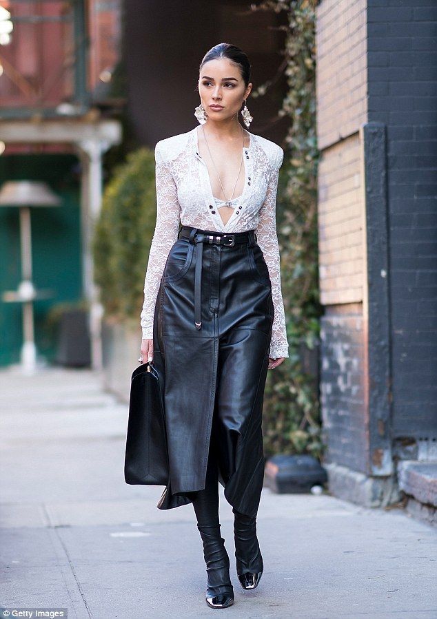 This outfit is a showstopper that perfectly balances feminine romance with fierce confidence. The midi leather skirt, with its high-waisted cut and bold front slit, adds structure and sophistication while exuding modern edge. Styled with a sheer lace bodysuit featuring delicate details and a deep neckline, it brings an element of sensuality without being over-the-top.
