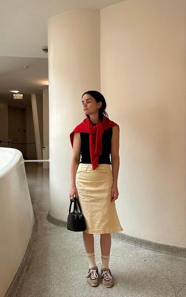 Oversized tortoiseshell sunglasses and a dainty gold pendant lend modern polish—proof that knee-length skirts can be both laid-back and endlessly refined.