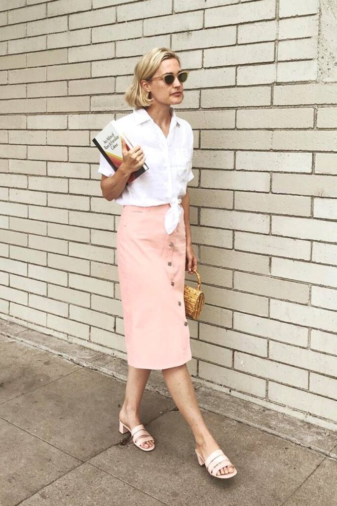 Effortless ease meets polished detail when a crisp white linen button-down is tied at the waist over a soft pink pencil skirt. The row of oversized buttons along the side seam adds a tailored, vintage-inspired touch that elevates the simple silhouette.