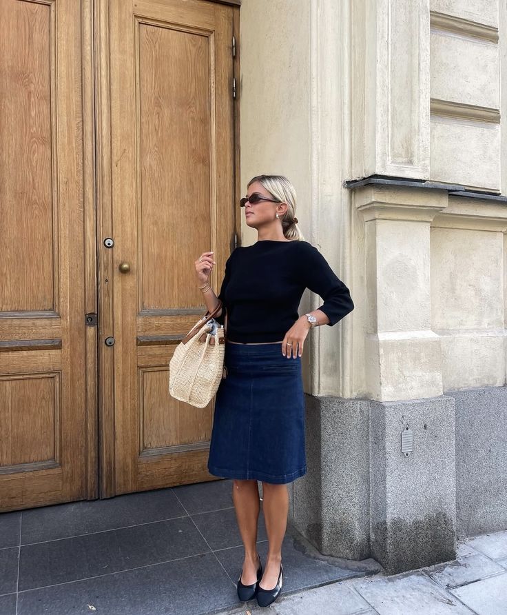 Pointed-toe black pumps echo the sweater’s tone, elongating the leg and lending a refined, ladylike finish. A woven straw tote introduces a whisper of texture and summer warmth, while slim gold hoops and oversized square sunglasses add just the right dose of glam.