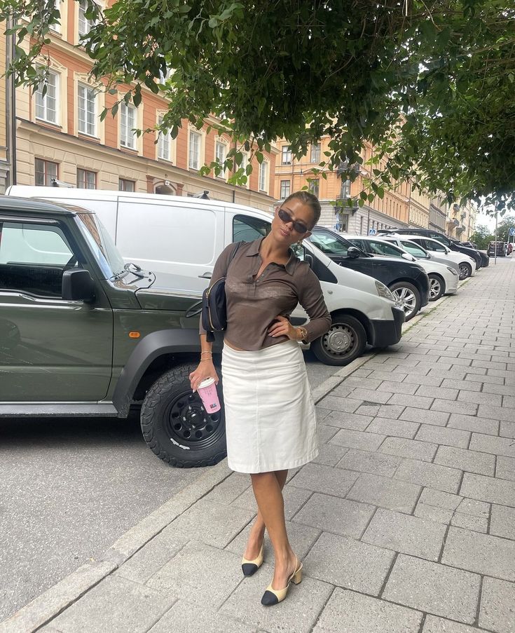 Polished hair clips and slim black sunglasses complete the look, proving that the right knee-length skirt can be both effortlessly chic and endlessly versatile.