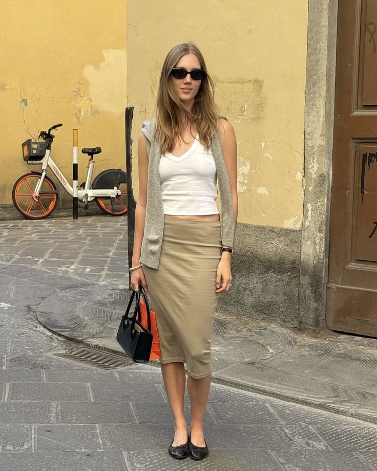 A pristine white ribbed tank creates a clean, contemporary base, perfectly balancing the structured lines of the beige knee-length pencil skirt. The skirt’s high waist and slight A-line flare lightly skim the hips, offering both comfort and a flattering silhouette.