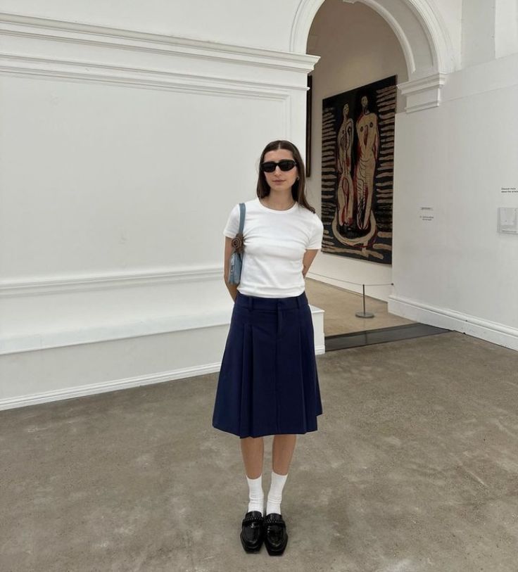 Tucked-in white cotton tee meets a knee-grazing navy skirt with crisp inverted pleats, creating a polished yet relaxed silhouette perfect for gallery strolls. The skirt’s structured drape subtly flares from the waist, gently skimming the knees while allowing for ease of movement.