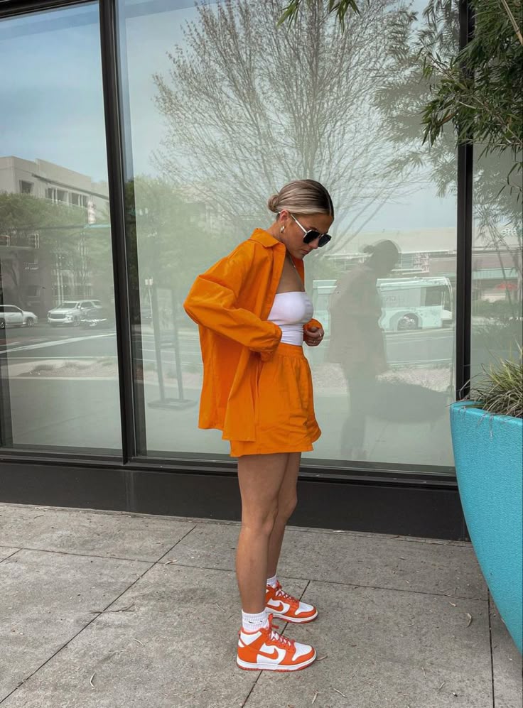 Nothing elevates your sneaker game like bold color coordination, and these orange-and-white Nike Dunk Highs are a perfect match for this vibrant summer set. The bright orange shorts and loose button-down shirt combo make a statement, balanced by a clean white bandeau top for contrast.