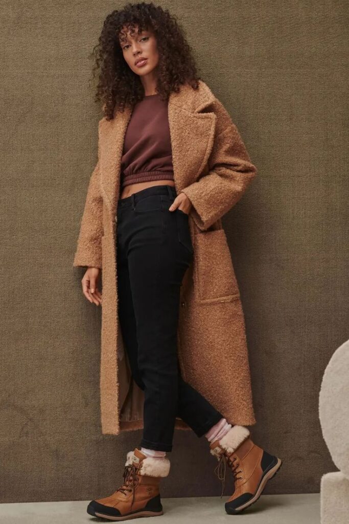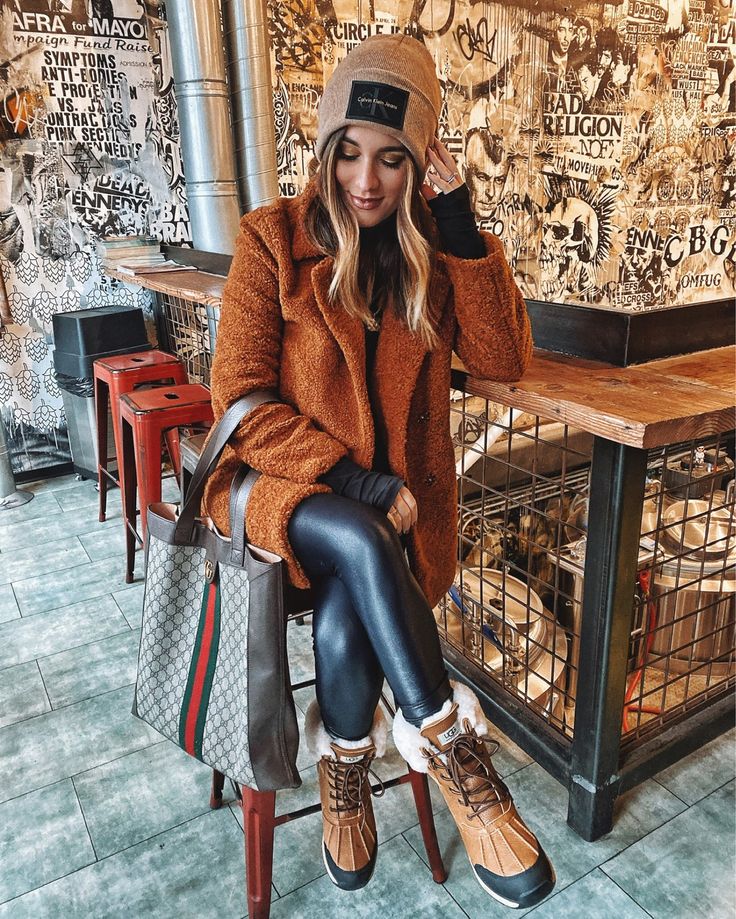Sleek black leggings provide a streamlined silhouette, balancing the oversized outerwear. The true stars of the look? Those shearling-lined duck boots, blending rugged practicality with chic winter charm.