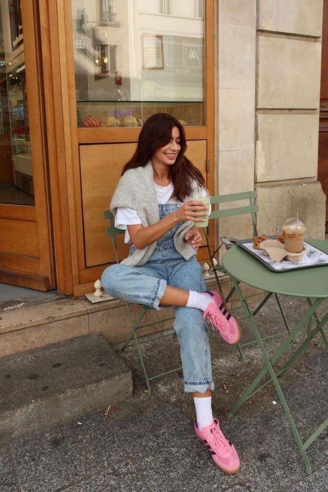 Rolled-up cuffs and white crew socks enhance the cool, carefree aesthetic. Bright pink Adidas Gazelle sneakers are injecting a fun pop of color that makes the outfit feel fresh and modern.