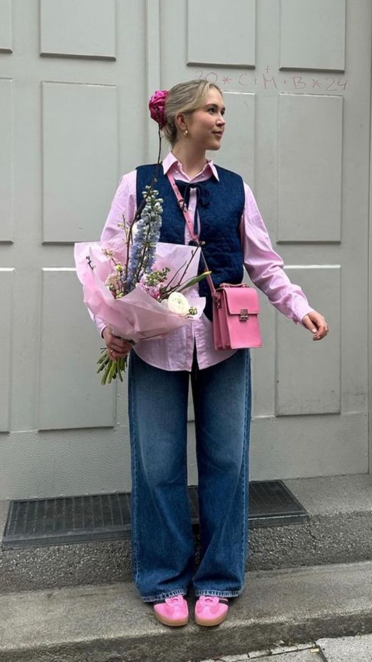 A quilted pink tote completes the ensemble, making it effortlessly chic and full of personality. This outfit is a perfect example of how to mix feminine, retro, and modern elements for a standout look!