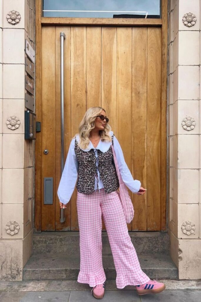 Layered on top, a leopard-print vest creates an unexpected contrast, adding just the right amount of edge. Blush pink Adidas sneakers tie in perfectly with the pants, keeping the look casual yet stylish.