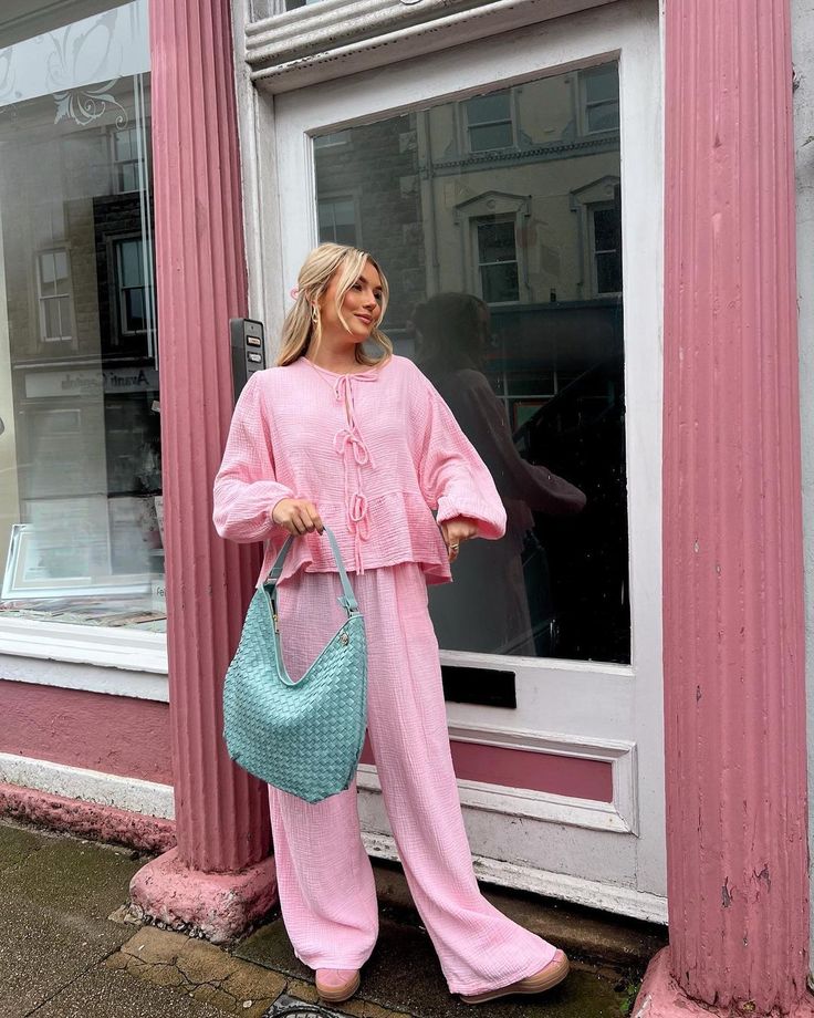 Head-to-toe blush pink creates a dreamy, effortlessly chic aesthetic that feels both cozy and elevated. The textured matching set—with its flowy wide-leg pants and oversized tie-front blouse—exudes relaxed sophistication.