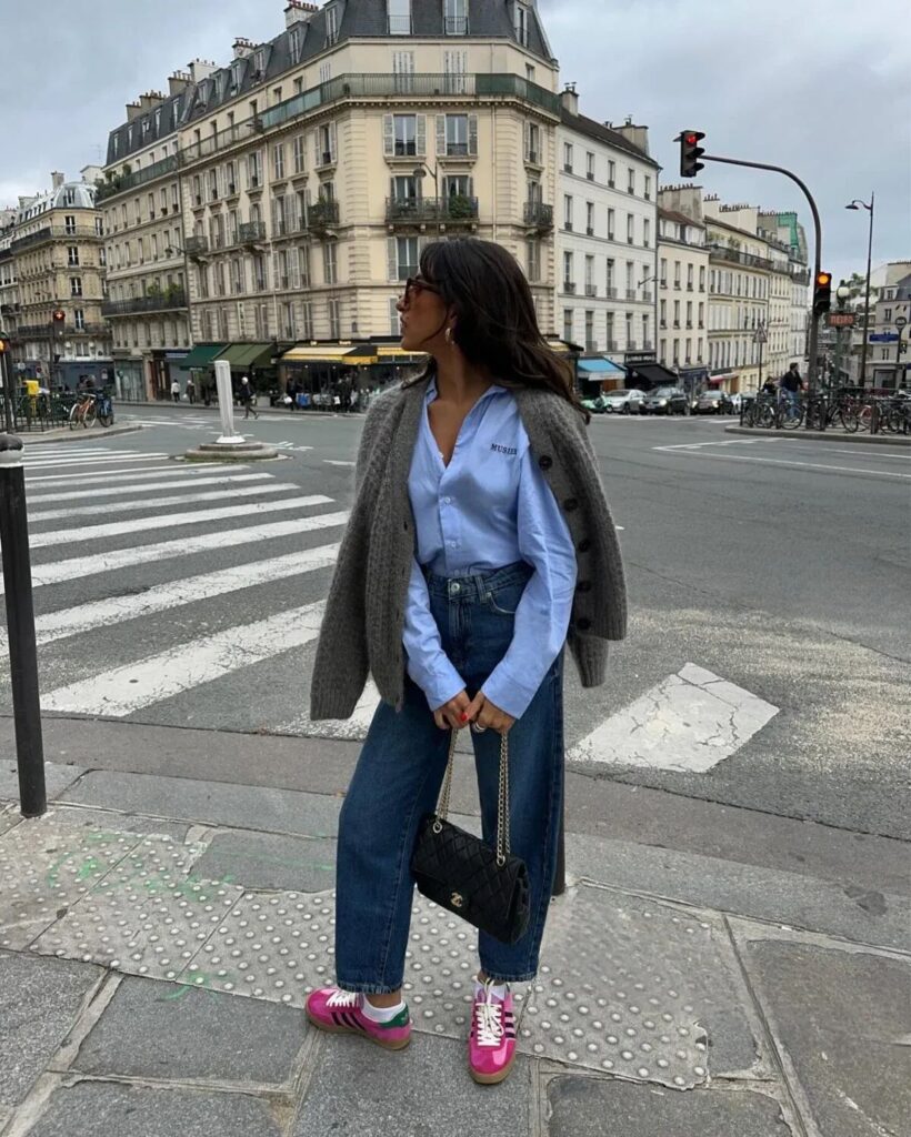 Draping a chunky gray cardigan over the shoulders adds a layer of relaxed elegance, while the black quilted Chanel bag grounds the look with timeless sophistication. Whether you’re strolling through Paris or channeling those city vibes at home, this outfit proves that a pop of pink can instantly energize your wardrobe basics.