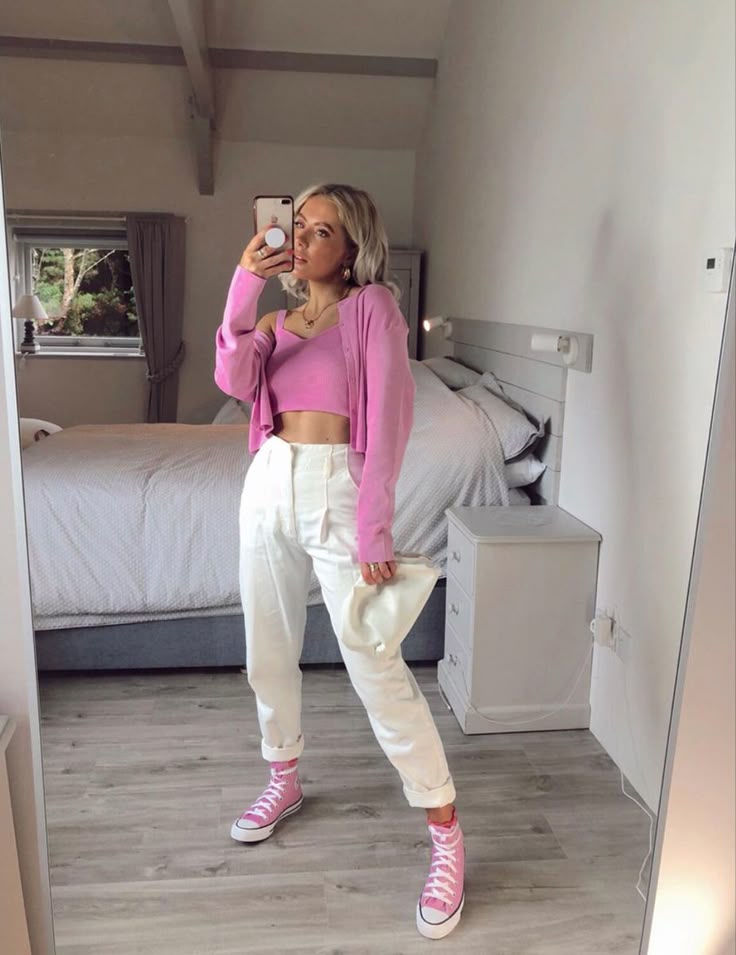 Embracing a coordinated palette makes this look effortlessly chic while still feeling playful. The combination of the soft pink crop top, matching cardigan, and classic high-top pink sneakers creates a cohesive, monochrome moment that’s both eye-catching and relaxed.