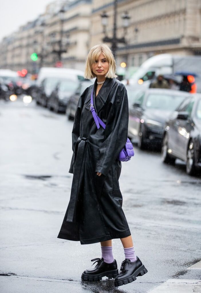 This rainy-day look is proof that platform loafers can be both grunge and girly — all at once. The oversized black trench brings drama, while the pastel purple socks and matching quilted bag add a pop of unexpected sweetness.