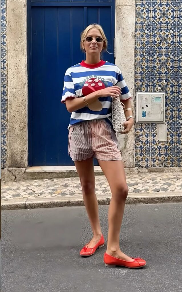 A pearl-beaded baguette bag injects a dose of unexpected glamour, making every market run feel like a style moment. Bright coral ballet flats mirror the tee’s playful energy while keeping the look grounded in easy-going comfort.