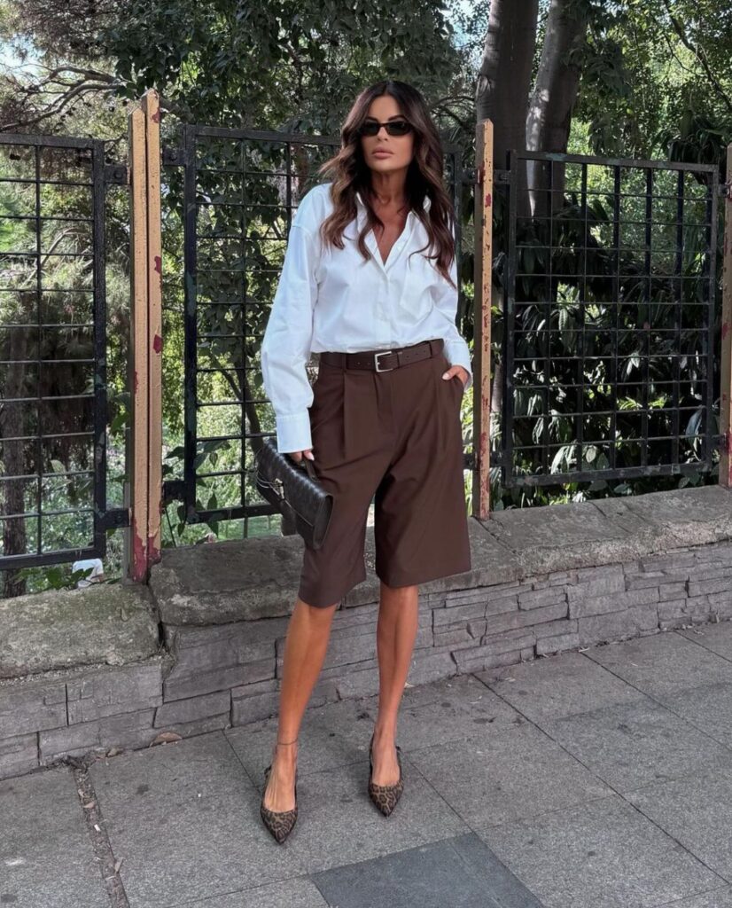Crisp white button-down and tailored chocolate-brown Bermuda shorts combine to create an effortlessly polished ensemble that reads straight off a luxury rack. The high-waisted cut and sharp pleats of the shorts sculpt the silhouette, while the matching leather belt adds a refined, custom-fitted finish.