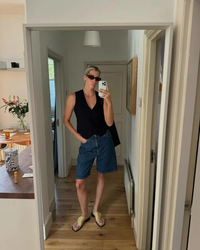 A tailored black sleeveless vest transforms oversized denim shorts into a polished silhouette that feels both high-end and utterly wearable. The long-line cut of the shorts nods to contemporary tailoring, while the rich indigo wash keeps the look sophisticated.