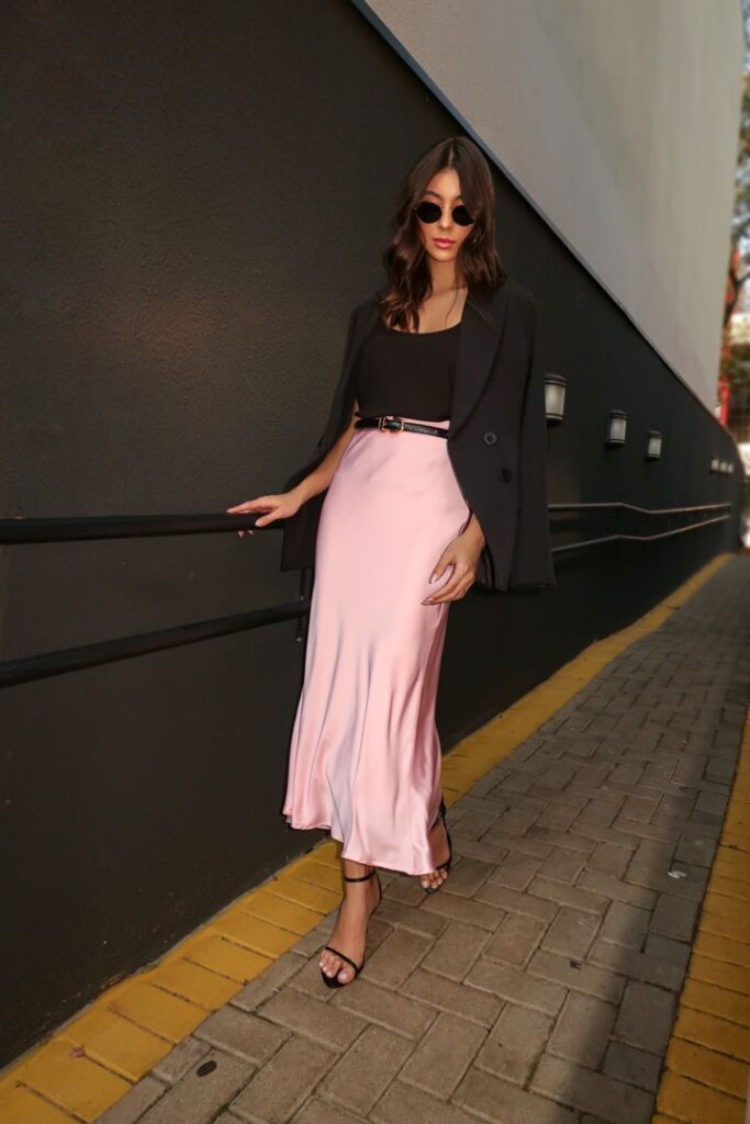Soft femininity meets sleek tailoring in this striking after-dark ensemble. A blush pink satin skirt floats effortlessly with every step, its gentle sheen catching the light and elevating the entire outfit. The fitted black tank and tailored blazer bring structured contrast, while the slim belt adds definition at the waist.