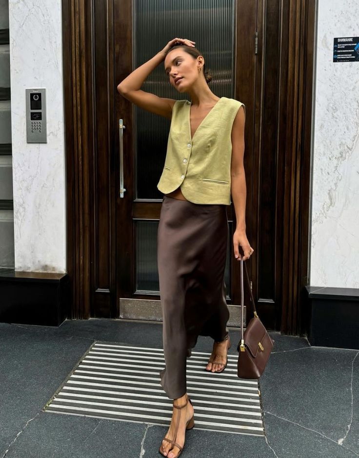 This outfit embraces understated elegance with a palette rooted in rich, earthy tones. A dark chocolate satin skirt flows beautifully, its liquid texture offering a refined contrast to the tailored linen-like yellow vest on top. The combination feels organic and grounded, yet elevated.