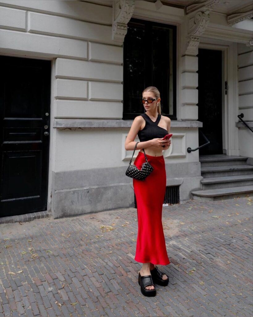 Bold and unapologetic, this red satin skirt look redefines what it means to dress down luxe fabrics. The fiery hue takes center stage, balanced by a sleek asymmetrical black crop top that adds a sculptural, contemporary twist. Instead of delicate heels, chunky black platform sandals anchor the outfit, giving it a downtown, fashion-editor vibe.