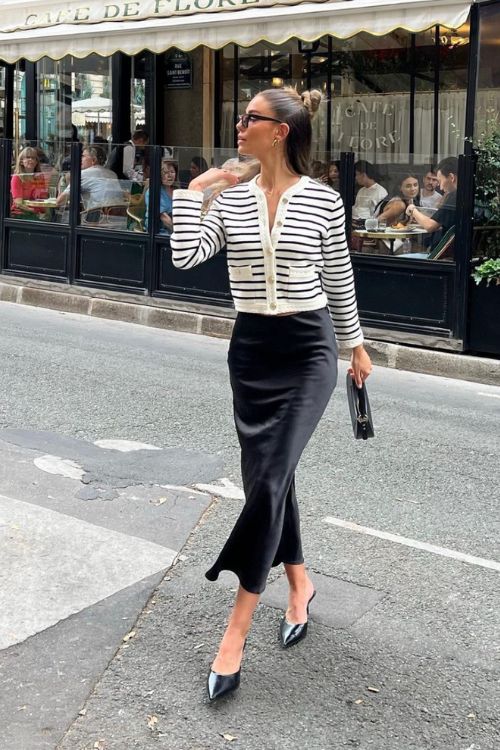 Classic elegance meets effortless French styling in this polished ensemble. A sleek black satin skirt sets the foundation, its fluid silhouette exuding quiet luxury. The striped cardigan tucked neatly at the waist adds a touch of nautical charm, while the deep V-neck and ivory trim elevate it beyond the casual.