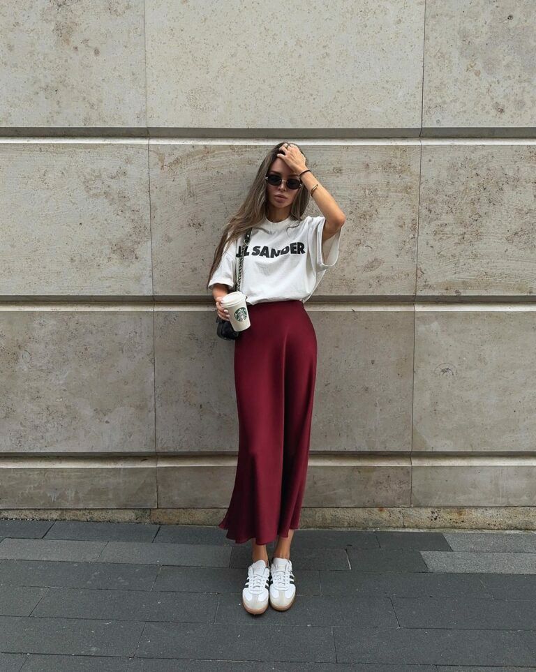 This outfit proves that satin skirts can go from elegant to effortlessly cool with a single swap. A deep wine-colored satin maxi anchors the look with its rich hue and fluid movement, while the oversized graphic tee adds a laid-back, off-duty energy.
