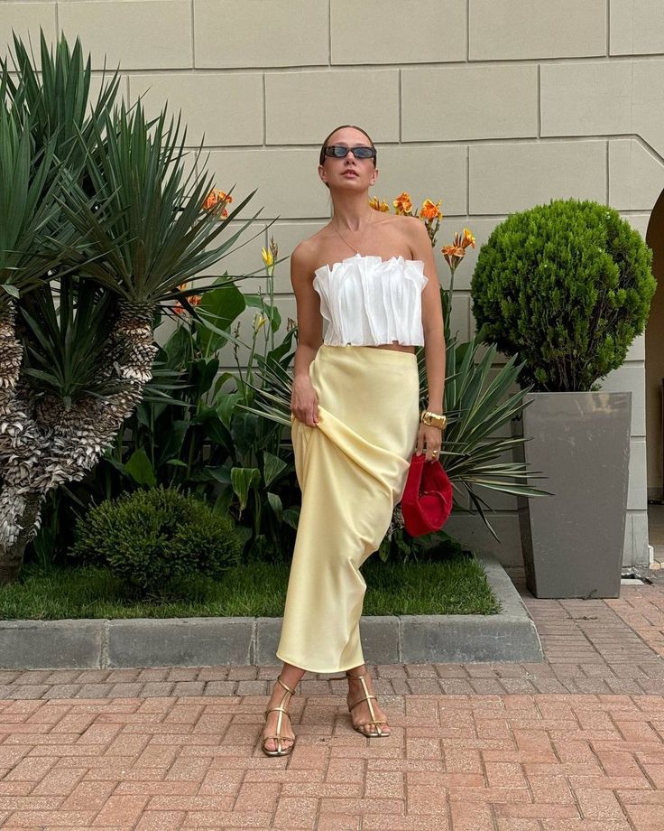 This sunshine-ready ensemble is proof that satin can shine brightest when styled with bold accessories and warm-weather ease. A soft lemon-yellow satin skirt flows effortlessly, catching the light with every step and creating a breezy yet luxe vibe. It’s paired with a textured white strapless top that adds volume and playfulness to the silhouette.