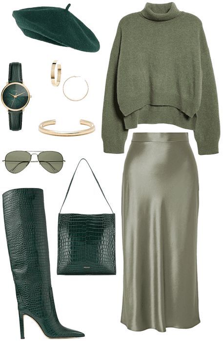 A soft, cropped turtleneck sweater adds warmth and dimension, perfectly complementing the luxe satin midi skirt that drapes beautifully for a fluid silhouette. The structured knee-high croc-embossed boots bring a bold, fashion-forward edge, while the matching croc-embossed handbag keeps the theme sleek and cohesive.