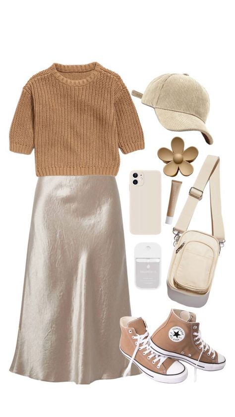 This effortlessly stylish outfit plays with neutral tones and cozy textures for a look that’s both laid-back and polished. A cropped knit sweater in a warm camel hue pairs beautifully with the champagne satin midi skirt, adding a touch of softness to the outfit. The look takes a sporty turn with classic high-top Converse sneakers in a matching earthy shade, giving it a relaxed yet trendy feel.