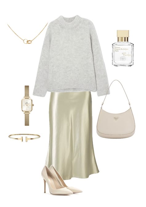 A relaxed gray knit sweater drapes effortlessly over a lustrous champagne satin midi skirt, striking a balance between laid-back comfort and luxe femininity. Cream pointed-toe pumps elongate the legs while maintaining an understated elegance.