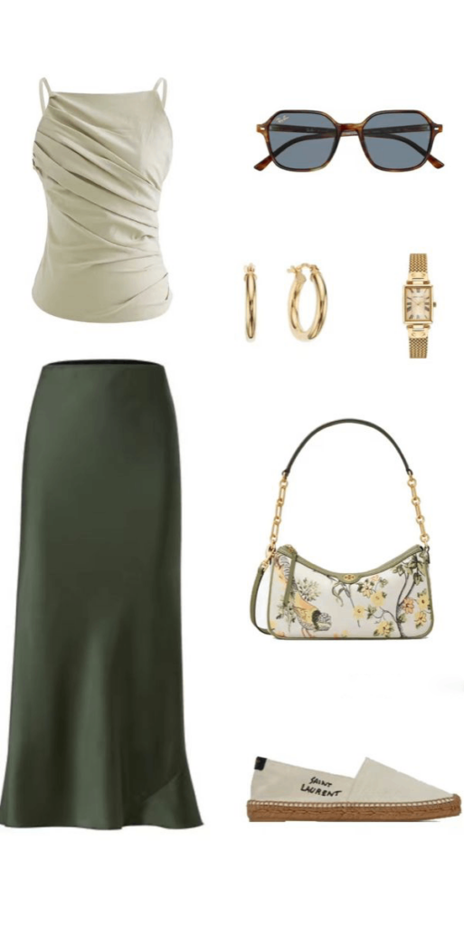 This outfit blends timeless sophistication with relaxed ease, featuring a ruched, off-white cami top that drapes elegantly over the body. Paired with a flowing, deep green satin midi skirt, the ensemble creates a perfect balance of structure and movement. Accessories like gold hoop earrings, a vintage-inspired gold watch, and tortoiseshell sunglasses add a refined touch, enhancing the understated luxury of the look.