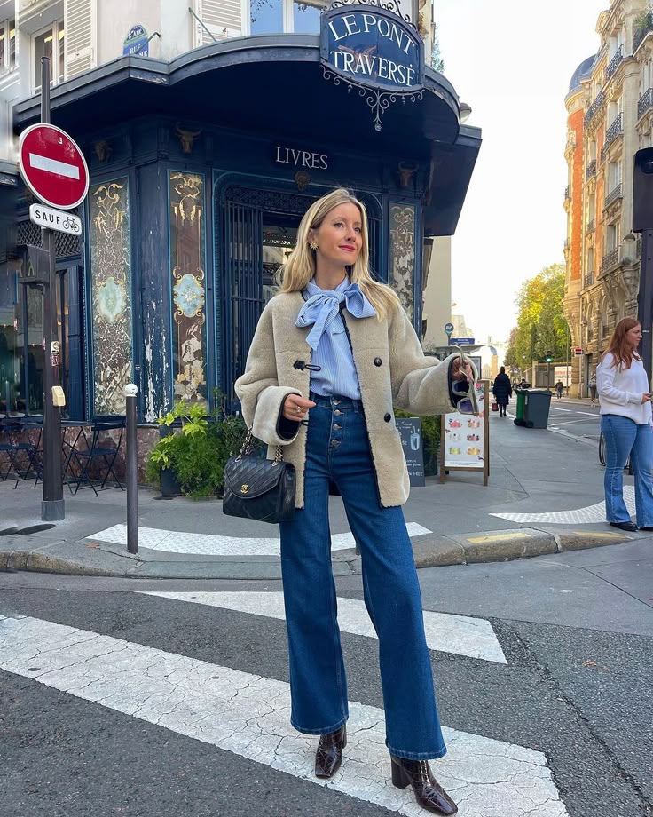 The soft beige coat brings a cozy and polished vibe, beautifully layered over a blue blouse with a romantic bow detail. High-waisted denim elongates the silhouette and adds a touch of retro charm, while the glossy ankle boots deliver just the right amount of sophistication.
