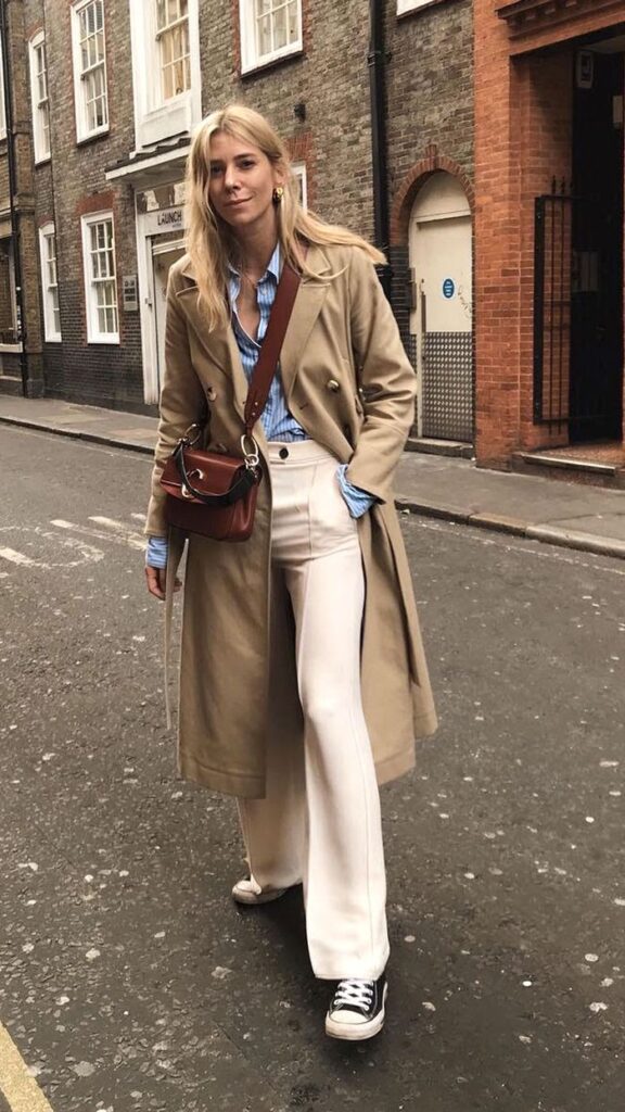 A classic trench coat instantly elevates the look, especially when paired with crisp white trousers and a sharp blue striped shirt. The unexpected addition of black sneakers brings a cool, laid-back edge that’s both practical and stylish.