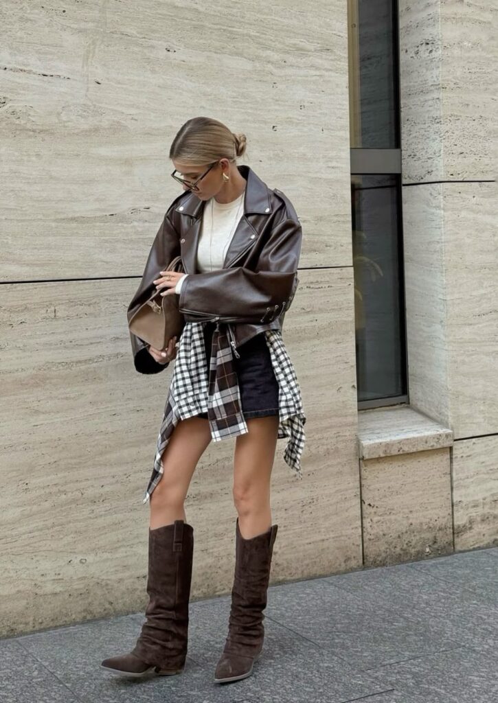 This outfit is a masterclass in layering with attitude. A sleek black mini skirt sets the base, while a cozy white tee and oversized chocolate-brown leather jacket bring in that effortless edge. The plaid shirt tied at the waist adds a playful, grungy vibe that breaks up the neutrals with pattern and movement.